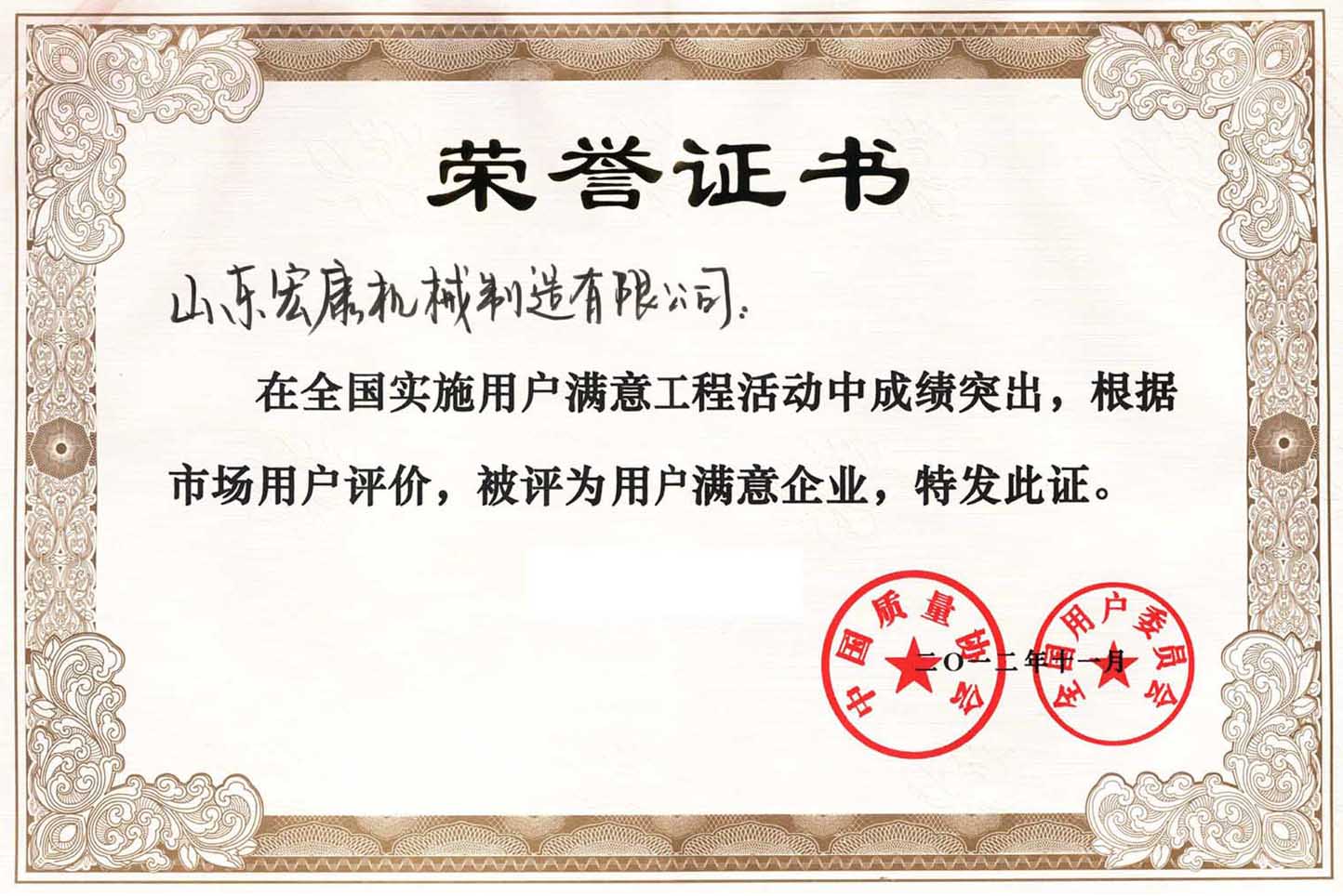 中国质量协会荣誉证书
