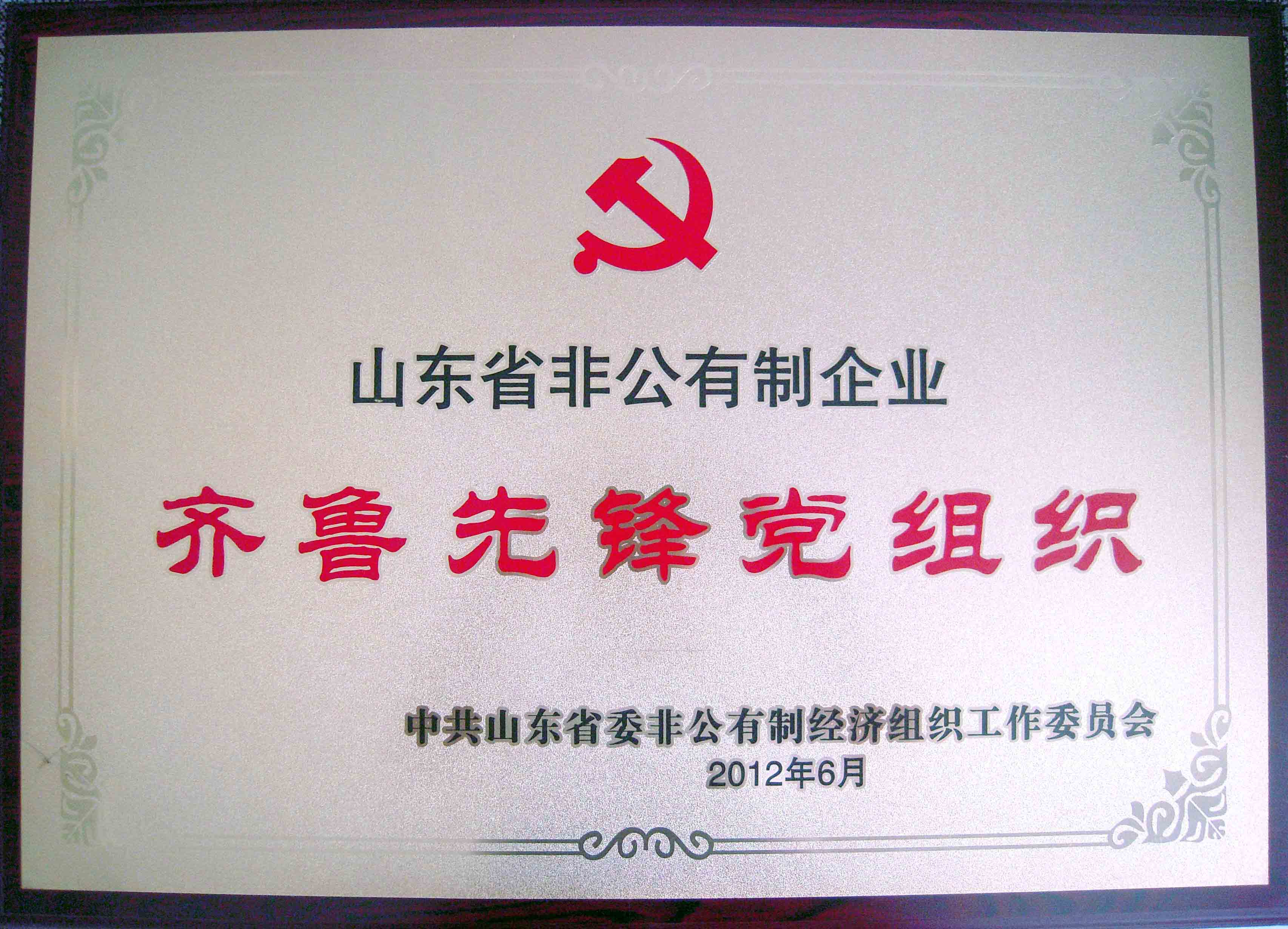 2012年6月,中共1xbet·官方站官网-1xbet(中国) 党总支委员会被中共山东省委非公有制经济组织工作委员会授予“山东省非公有制企业齐鲁先锋党组织”荣誉称号。